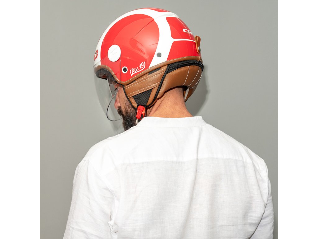 - Kompaktní, kulatá,lehká ,retro přilba v klasické červené barvě s moderním tvarovaným plexi .