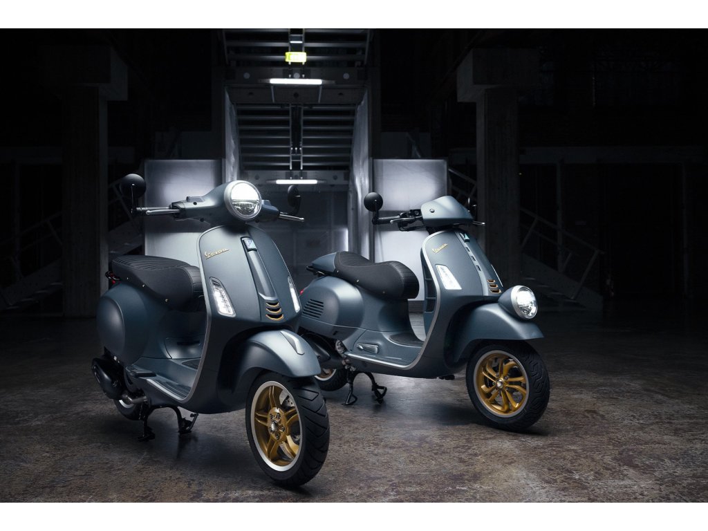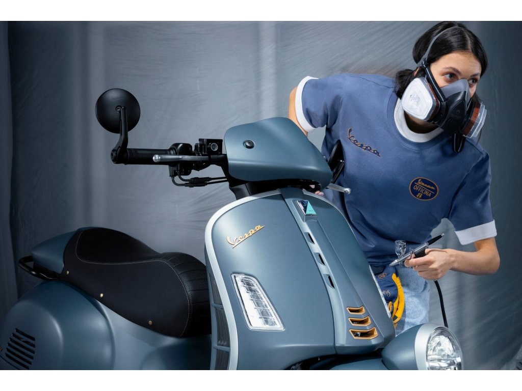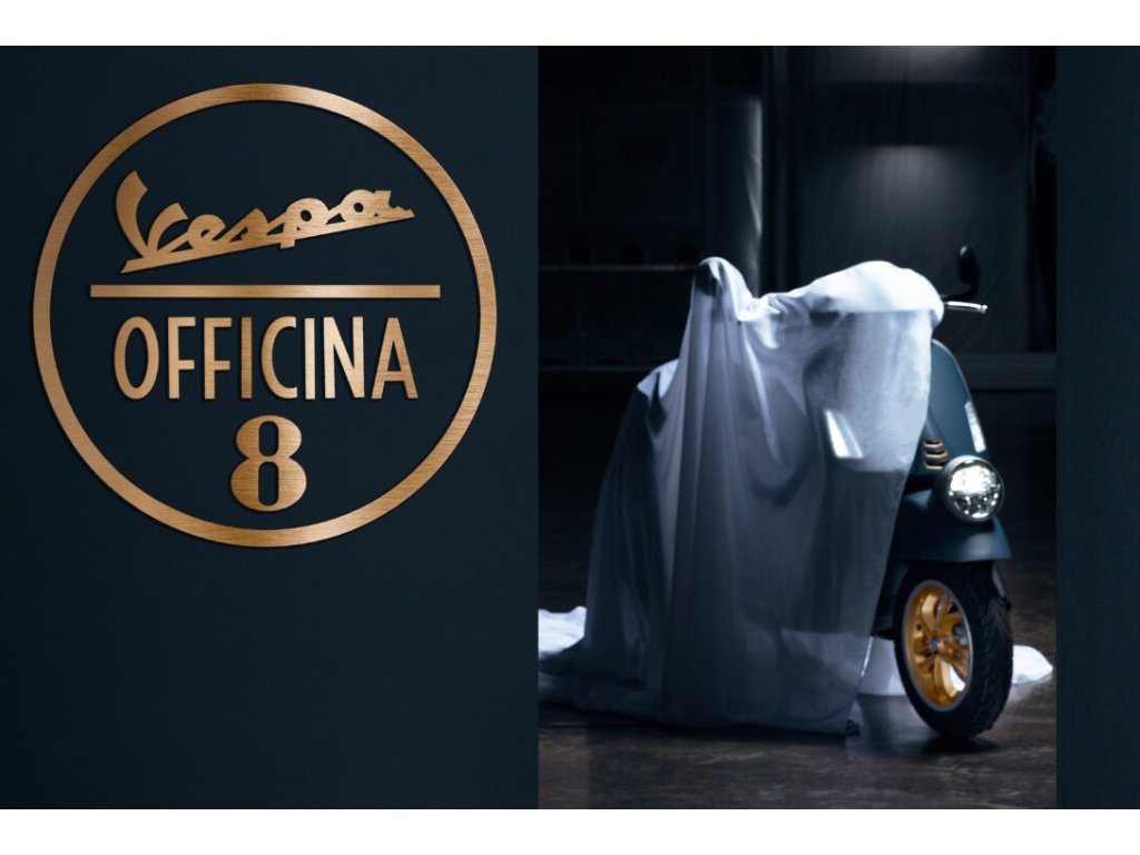 Velká Vespa se světlometem na blatníku.Nekapotovaná řidítka a velký digitální budík.Jako že vytuněná v Officině 8.Hold dlouhé historii a tradici v aktuálním zjevu.Detaily a zlatá kola to jistí.A jsou nachystané i ladící doplňky kolekce Officina 8.